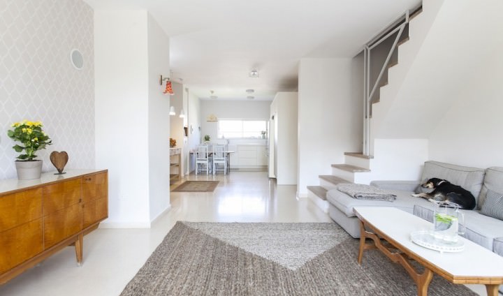 לדירה שתי קומות: קומה א' בשטח של 100 מ״ר וקומה ב' בה לא נגענו משיקולי תקציב.